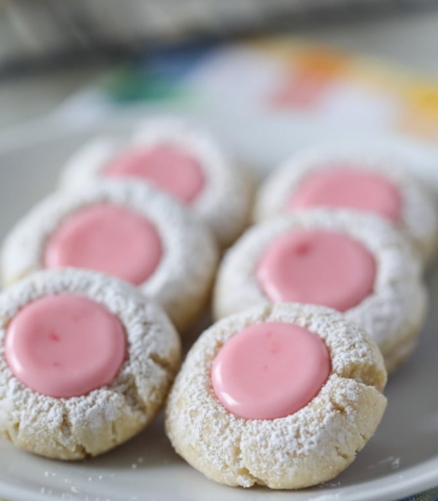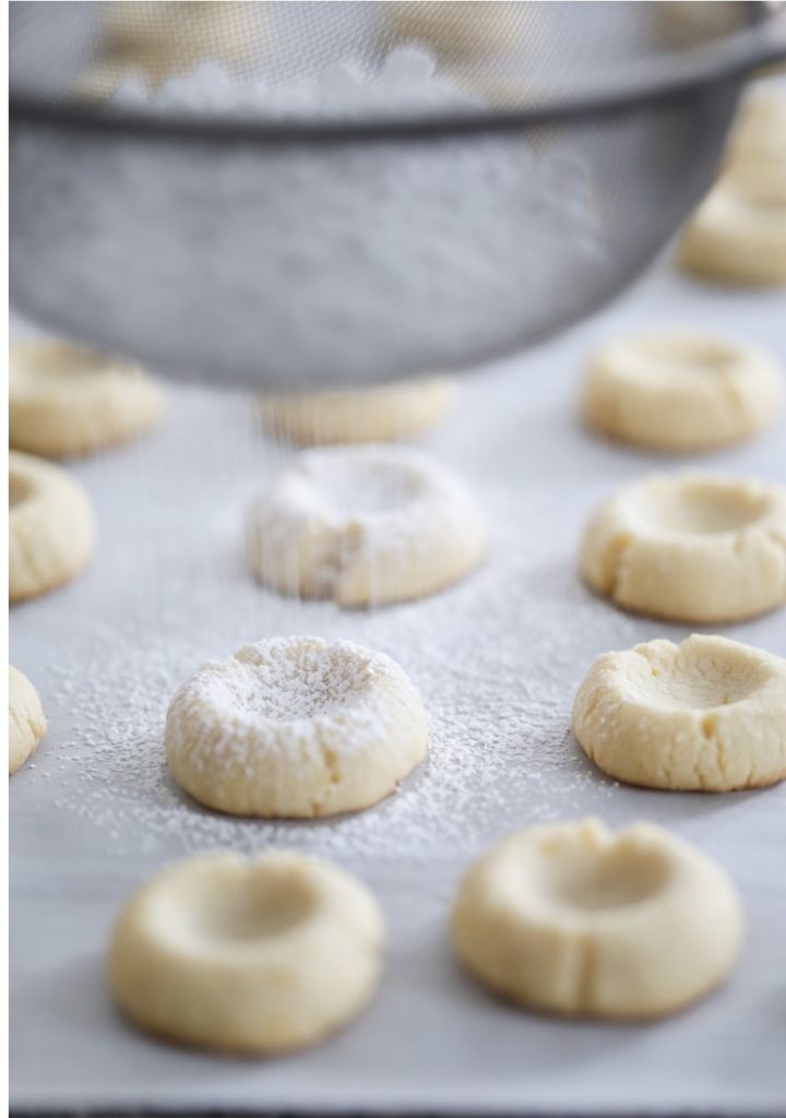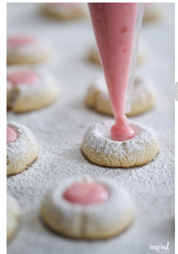 Dust the cookies with powdered sugar. Then spoon or pipe the glaze into the indent. Let cookies set for at least 10 minutes.