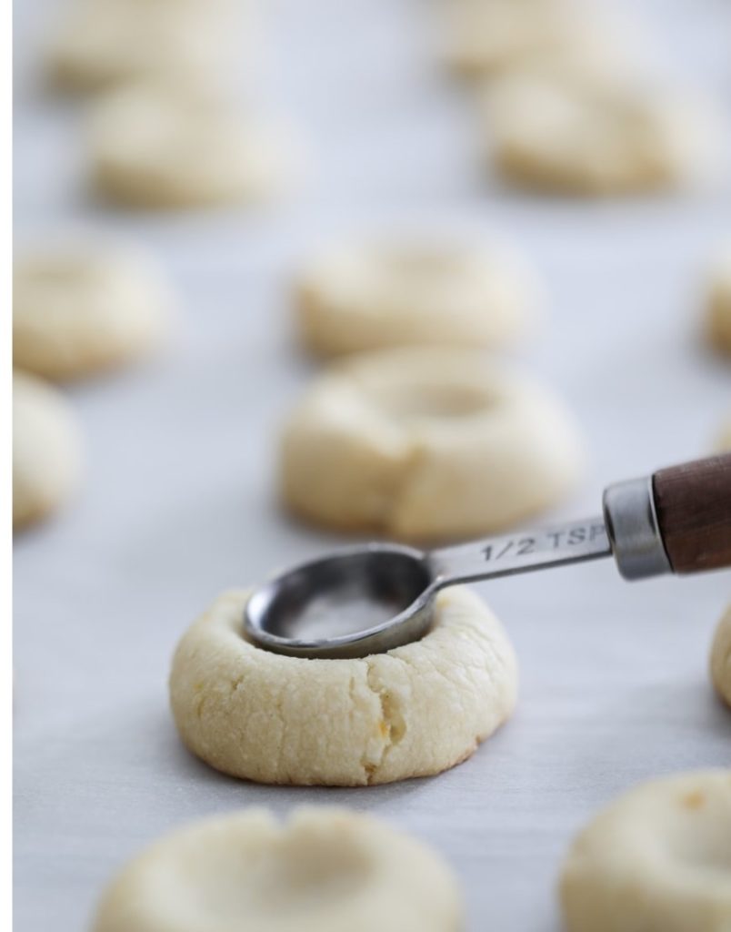 Bake for 10 minutes. Then gently press the rounded part of a teaspoon or the end of a wooden spoon handle into the center of each ball to create an indent. Continue baking for 16-18 more minutes or until cookies just start to brown on the bottom. Place cookies on a wire rack to cool.